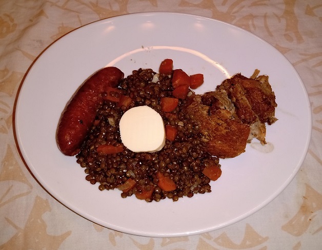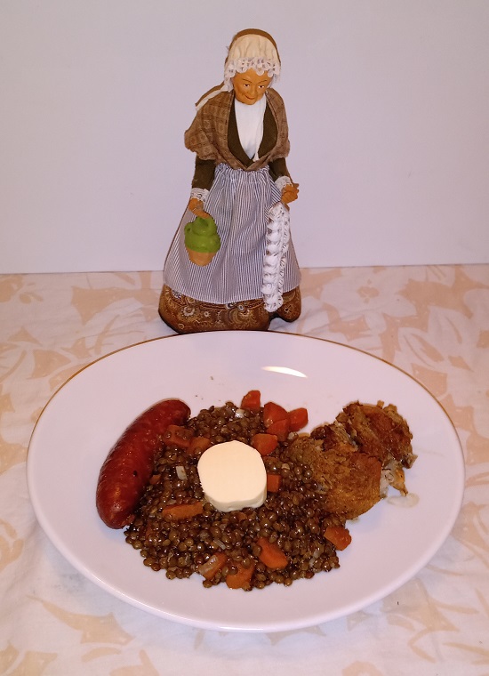 L'hiver 2020 approche à grands pas et nous allons nous réchauffer un peu avec un bon plat de lentilles du Puy accompagné d'une belle palette brisée et mijotée au vin blanc et des diots de Savoie également mijotés au vin blanc. Ce plat simple doit être préparé avec amour.