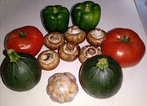 4 à 6 belles tomates à farcir. 2 à 4 courgettes rondes très fermes, petites ou moyennes ( attention aux graines) ou des petites courgettes bien fermes coupées en tronçons.. 2 à 4 petits poivrons verts et rouges ou comme ici, des poivrons dits "corne de boeuf. Facultatif: 2 aubergines. 8 à 12 gros champignons de préférence rosés. 1 tête d'ail nouveau. Facultatif: 2 pommes de terre fermes moyennes à grosses coupées en deux. Vous pouvez remplacer les champignons de couche par de bons Lactaires délicieux nommés Pinins ou Sanguins en Provence, Roussillons ailleurs. Un délice !
