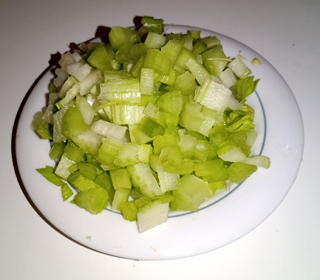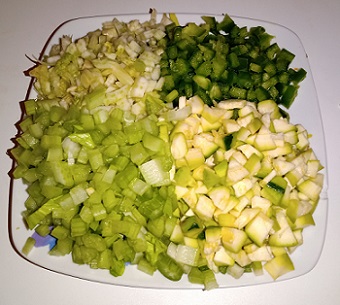Laver tous les légumes. Éplucher l'oignon et l'ail. Débiter l'oignon en très petits dés. Les gousses d'ail seront passées au presse-ail. Éplucher la courgette et la débiter en très petits dés. Couper le poivron en fines lanières, puis en très petits dés. Couper les branches de céleri en petits tronçons. Débiter la partie centrale du coeur de fenouil en très petits dés. Ébouillanter et peler les tomates. Les découper en très petits dés.