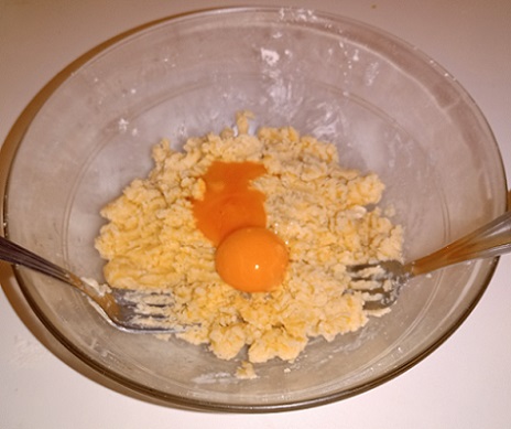 Fraiser avec 2 fourchettes. Bien faire absorber le beurre. Ajouter les jaunes d'oeufs.