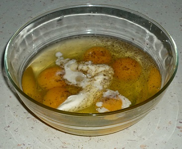 Placer 5 oeufs dans le saladier. Saler, poivrer et Ajouter la crème. Battre en omelette.