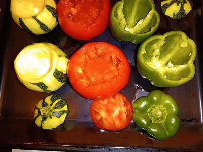 Couper le dessus des courgettes et les évider de la même façon que les tomates. Ne pas laisser les graines. Couper cette pulpe en petits morceaux et les ajouter à la pulpe de tomate réservée. Conserver les chapeaux qui viendront les couvrir une fois farcies. Procéder de la même façon pour les poivrons qui seront coupés aux 3/4 de la hauteur, égrenés. Le chapeau sera conservé avec sa queue pour faire plus joli ou il sera coupé en petit morceaux qui seront mélangés aux dés de tomate et de courgette. Les champignons seront simplement lavés. La queue sera reservée pour la présentation. Les pommes de terre seront choisies assez rondes, elle pourront ou non être épluchées. Il faudra trancher les extrémités et les évider comme les tomates. Si vous ajoutez quelques oignons, il seront évidés de la même façon. Les aubergines seron coupées en tranches épaisses dans la longueur. Ces tranches seront revenues à l'huile d'olive, avant d'être farcies et roulées.
