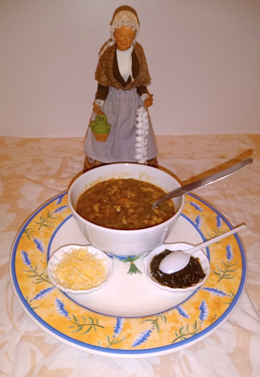 Cette soupe Provençale très riche en légumes d'été, et parfumée aux accents de garrigue, déposera sur votre table, un beau rayon de soleil. Elle est traditionnellement présentée dans sa cocotte de cuisson, accompagnée de son bol de sauce pistou et son Emmental ou gruyère râpé. Puisqu'elle se congèle facilement, elle pourra être servie durant la saison sombre et froide pour remonter le moral. Il faut profiter de l'arrivée de bons haricots verts fins et mange-tout, de beaux cocos frais et de belles tomates pour se mettre aux fourneaux. C'est une soupe de légumes, riche mais classique. Il convient toutefois de ne pas jeter les légumes dans l'eau comme on le ferait pour n'importe quelle soupe "à la va vite", mais de les faire réduire gentiment à l'huile d'olive avant de les mouiller. Je pratique d'ailleurs cette méthode pour toutes mes soupes de légumes. Chacun est libre d'y ajouter carottes pommes de terre et même navets, à condition bien entendu, que ces légumes soient nouveaux. Pas de navets et de carottes dits "à bestiaux". Donc, pas de polémiques à ce sujet. Elle sera d'ailleurs bien meilleure avec. Ici, je vous propose une version enrichie et plus parfumée, sans navets mais avec céleri et fenouil et dés de poivron vert et rouge pour apporter un peu de couleur et de saveurs méridionale.. En aucun cas, elle ne sera réalisée avec un quelconque légume en conserve, mise à part l'éventuelle pulpe de tomate Italienne. Surtout pas de bouillon de volaille, de lard ou autre hérésie ! Et encore moins de concentré de tomate Chinois, ni dans la soupe, ni dans la sauce Pistou et pas non plus de légumes du Benelux sans aucune qualité gustative ! La soupe au pistou, c'est la soupe du jardin d'été par excellence. A ce titre, aucune viande et aucune charcuterie ne viendra perturber ces arômes délicats. Et surtout pas d'autocuiseur ! Cette soupe au Pistou pourra être surgelée et être servie plus tard, pour, comme la ratatouille traditionnelle, venir ensoleiller quelques déprimantes soirées d'hiver. Elle peut être conservée au frais, mais pas longtemps car elle tourne très vite, et encore plus vite si vous y mettez des haricots rouges et pommes de terre !