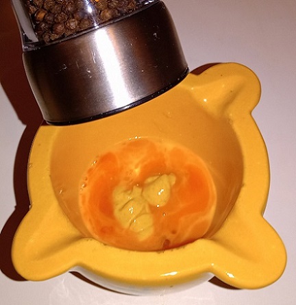 L'ail en pommade. Ajouter les 2 jaunes d'oeufs. Ajouter la moutarde. Poivre noir du moulin.