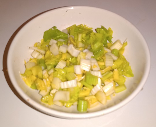 Les dés de partie tendre d'oignon. Les gousses d'ail. Les dés de courgette.