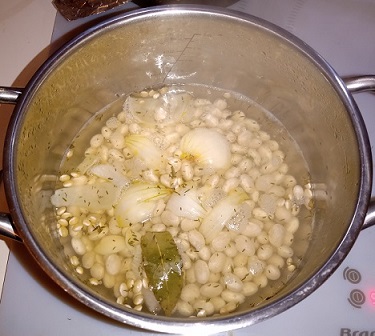Faire précuire 15 minutes les haricots cocos dans un bouillon aromatisé avec les partie extérieures d'oignon, ail, laurier thym et sarriette, car les haricots en grains, nécessitent une cuisson plus prolongée que les autres légumes, mais ils doivent rester fermes. Si vous ne trouvez pas de haricots rouges frais, vous pouvez utiliser des surgelés ou en conserve. Dans ce dernier cas, il est inutile de les faire précuire.Il seront simplement ajoutés aux cocos blancs précuits.