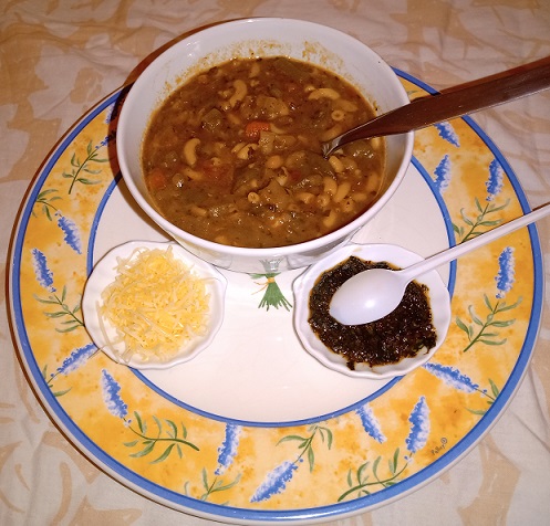 Préparer toutes les épices sur une petite assiette afin de ne pas en oublier. ( Paprika, piment doux, piment d'Espelette, origan, marjolaine, sarriette, anis vert, sel et poivre ) Dans un petit saladier, hacher l'ail. Verser l'huile d'olive. Piler l'ail en pomade. Hacher les bouquets de basilic. Piler de nouveau. Ajouter er les épices et herbes. Ajouter un peu de Tabasco et bien mélanger. Mettre en pot puis laisser reposer au frais. Un tiers sera réservé pour la cuisson, le deuxième pour la fin de cuisson, juste avant d'incorporer les pâtes, et le dernier sera déposé sur la table pour ceux, (ils sont en général nombreux), désirant en ajouter un peu dans l'assiette. Le basilic, bien que perdant une bonne partie de son arôme à la cuisson, apportera tout de même sa petite touche de fraîcheur,surtout pour le basilic Grec, et la soupe sera bien meilleure.