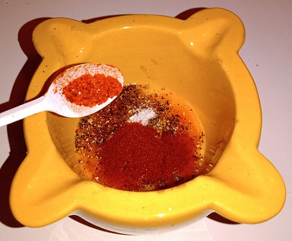 Mélange 5 baies du moulin. Sel de mer du moulin. Ajouter le piment doux. Ajouter le piment d'Espelette.