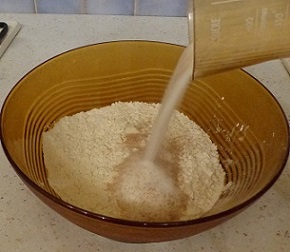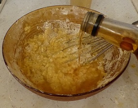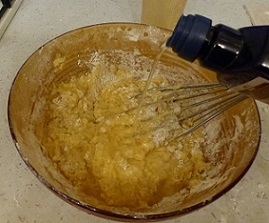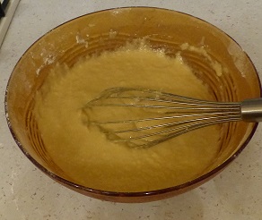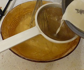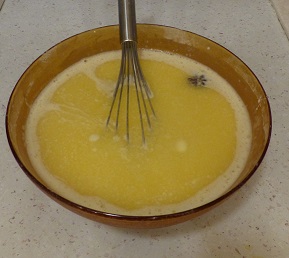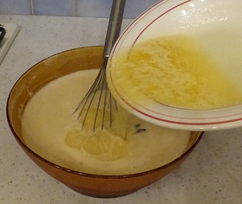Le beurre fondu. Verser le beurre fondu. Fouetter doucement. Puis plus vite en brassant.
