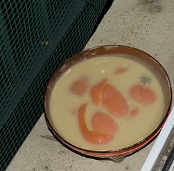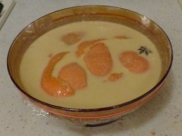 Après une nuit de repos, sortir le saladier, découvrir et répéter cette opération de piquage du zeste. Elle sera répétée encore une fois juste avant de préparer les crêpes. A ce moment là, les zestes seront pressés, égouttés et jetés, ainsi que l'étoile de badiane.