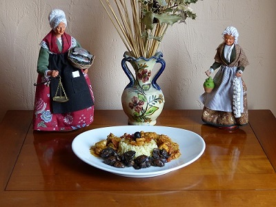 Dans une cocotte, verser 3 cuillères à soupe d'huile d'olive et placer à feu moyen. Placer les émincés marinés et les faire revenir de tous les côté. Les réserver dans la plat de marinade. Faire revenir les os de tous les côtés et les placer sur le bord. Déposer les lardons et l'oignon coupés en petits dés. Faire revenir 5 minutes. Ajouter quelques tranches de Chorizo et les gousses d'ail non épluchées pour un cuisson "en chemise". Laisser revenir 5 minutes et ajouter les émincés réservés et la marinade. Saupoudrer herbes et épices et ajouter le bouquet garni. Bien mélanger et faire revenir 2 minutes. Ajouter les morceaux de tomate et le vin blanc.
