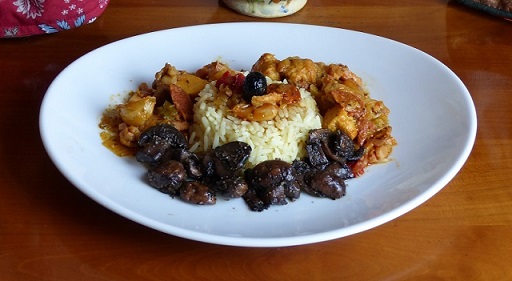 400 g environ d'émincés de lapin. 1 oignon tendre. 2 têtes d'ail si possible nouveau. 1 bouquet garni. 200 g de lardons nature. 20 cl de vin blanc sec. 1 petite branche de romarin. 3 feuilles de sauge. 3 pincées de marjolaine. 3 pincées d'origan. 4 tomates bien mûres ou une boite de tomates Romana. 1 douzaine d'olives vertes nature ou aux anchois. 1 douzaine d'olives noires. 3 pincées de sucre. Sel et poivre 5 baies. 1 cuillère à café de Paprika. 1 cuillère à café de mélage 3 Currys. 1/2 cuillère à café de piment d'Espelette.