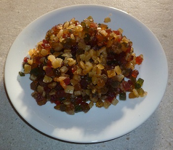 Le mélange de farine. Les dés de fruits confits. Les fruits confits entiers Les Calinous.