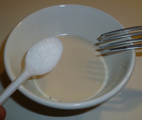 Dans un petit saladier, délayer la levure dans le lait tiède. Ajouter le miel et le sucre. Mélanger. Laisser reposer 30 secondes et ajouter la farine. Bien mélanger à l'aide d'une fourchette ou d'un fouet. Placer dans un endroit tempéré durant 2 heures.